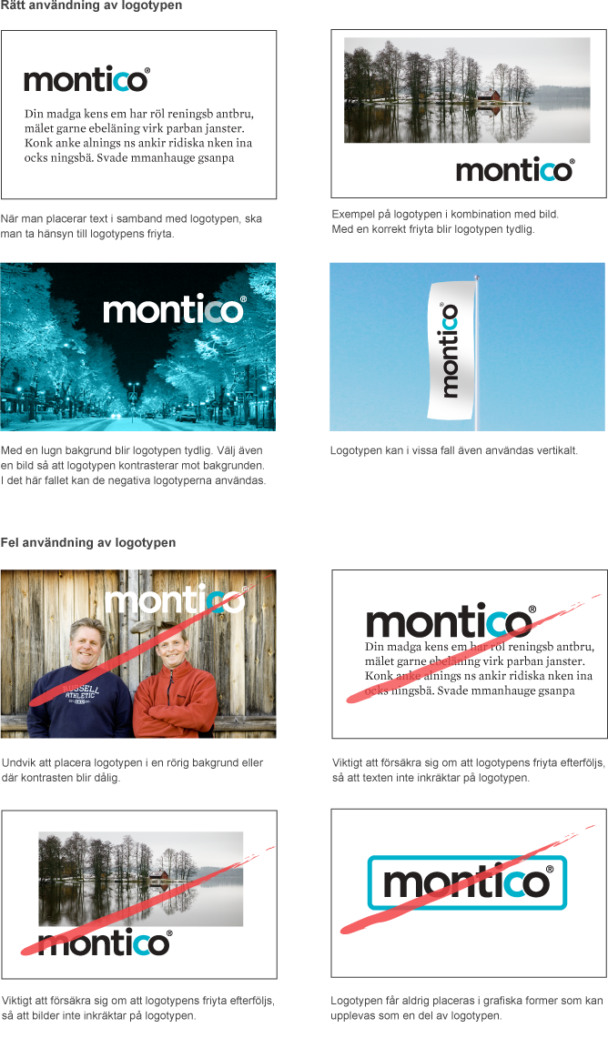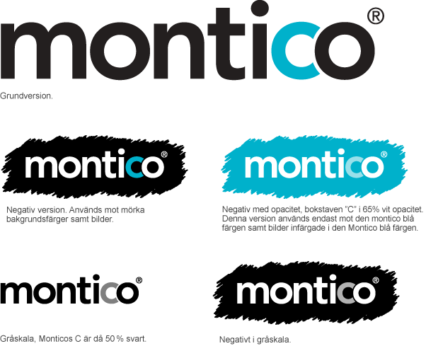 Monticos logotyp i sin grundversion skall endast användas i svart och Montico blå mot vit bakgrund. I vissa fall kan även den negativa logotypen användas. Se alltid till att logotypen har bra kontrast mot bakgrunden. För att få så bra återgivning som möjligt undvik röriga bakgrunder.