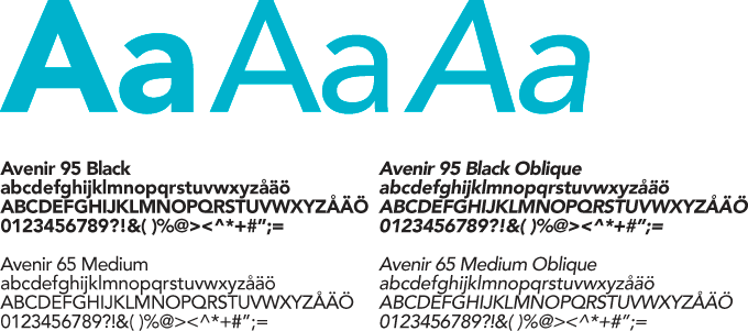 Genom att variera grader och skärningar skapas spännande kontraster, något som är en viktig del av Monticos identitet. Som huvudtypsnitt används Avenir - ett väl genomarbetat typsnitt som är modernt och flexibelt. Det finns i flera skärningar som passar i både större och mindre grader. Avenir används primärt i rubriker, men fungerar även bra som brödtext.