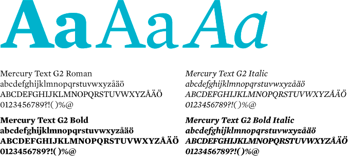 Som grund i brödtext används Mercury Text G2 Roman. Italic kan användas i t ex ingresstexter och bildtexter. Mercury Text G2s Boldvarianter kan exempelvis användas för att lyfta fram vissa ord i löptext.