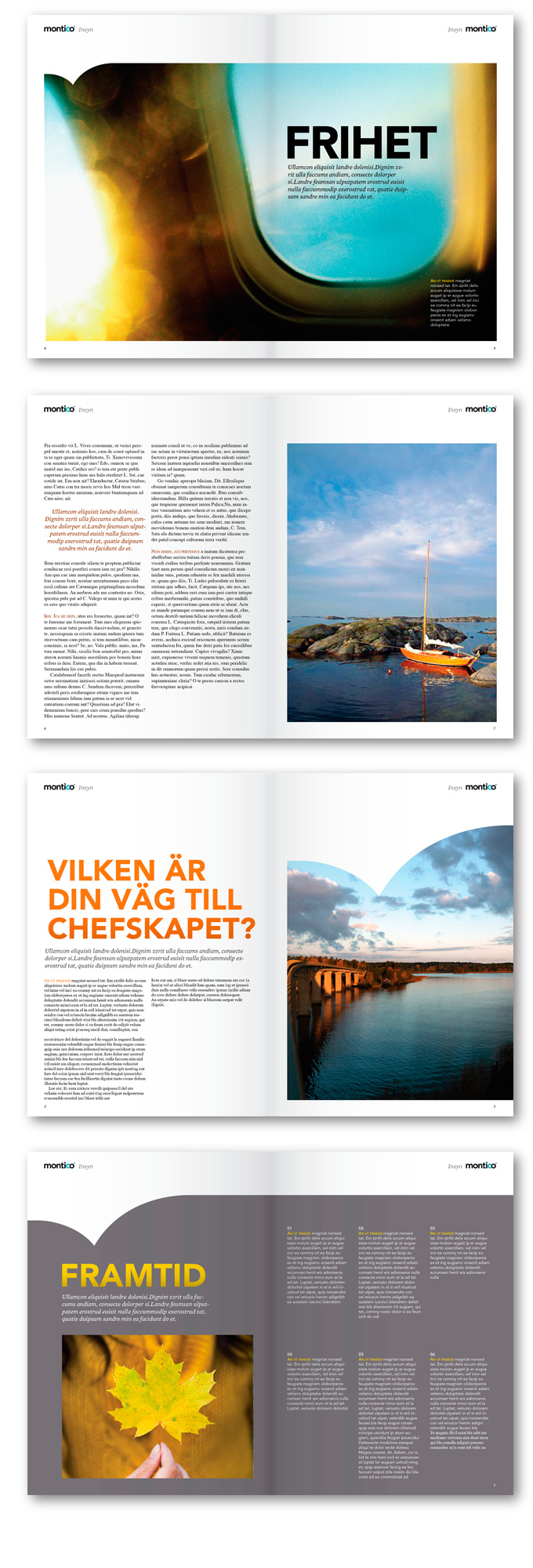 I trycksaker används Avenir versalt som rubrik på omslagen för att ge Montico ett enhetligt uttryck. Avenir 95 Black kan även användas som rubriker i inlagorna.